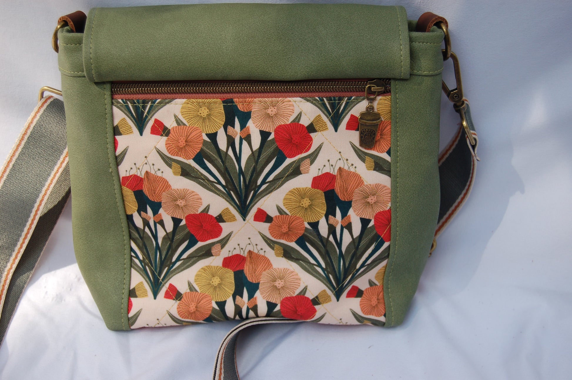 Very soft green faux leather with quilted flower and dash cotten fabric as an accent.